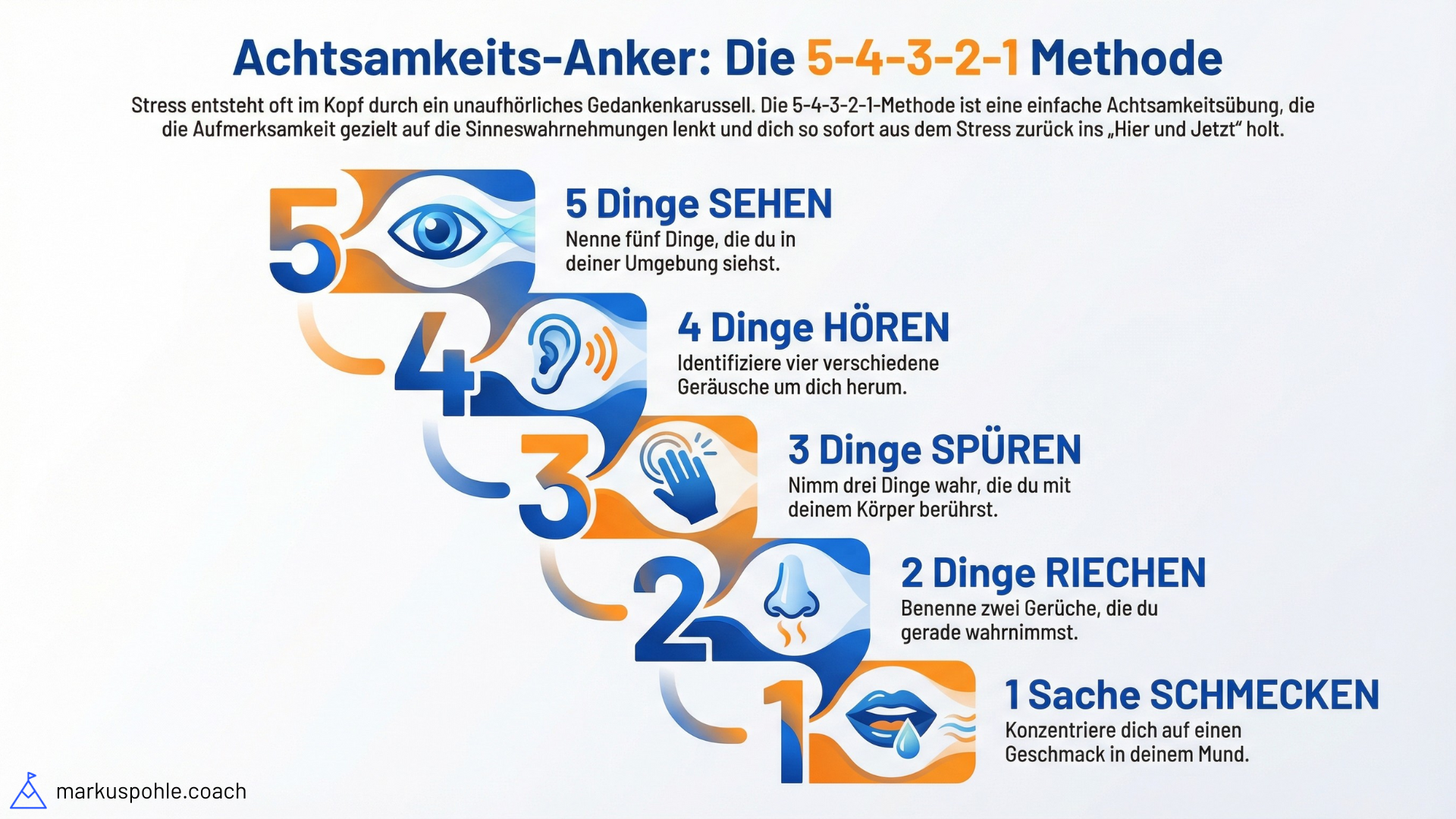 5-4-3-2-1 Methode zur Achtsamkeit: Sehen, Hören, Spüren, Riechen, Schmecken.