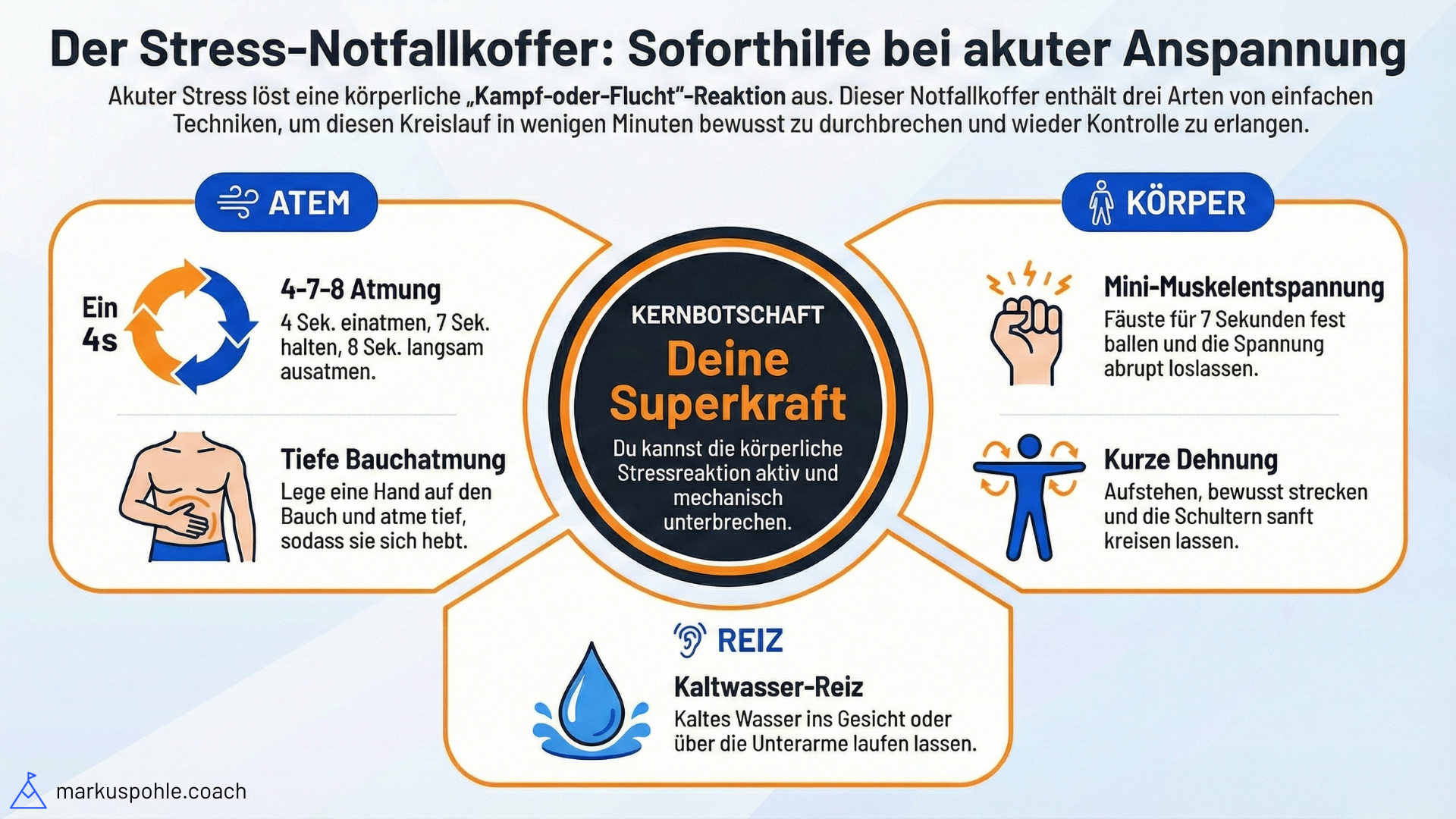 Stress-Notfallkoffer: Atemübungen, Muskelentspannung, Kaltwasserreiz zur Soforthilfe bei Anspannung.
