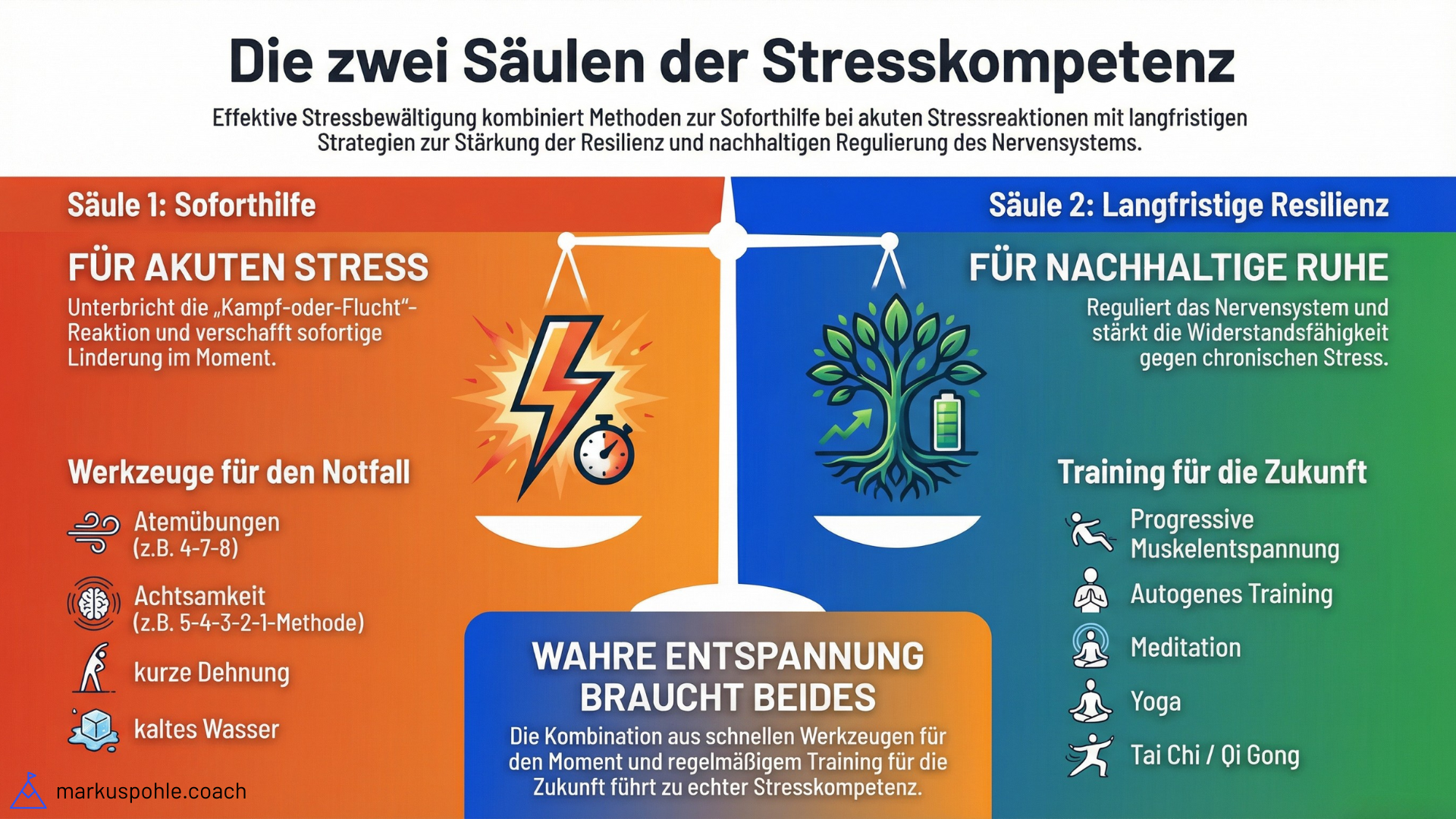 Zwei Säulen der Stresskompetenz: Soforthilfe (Atemübungen) und langfristige Resilienz (Yoga, Meditation).