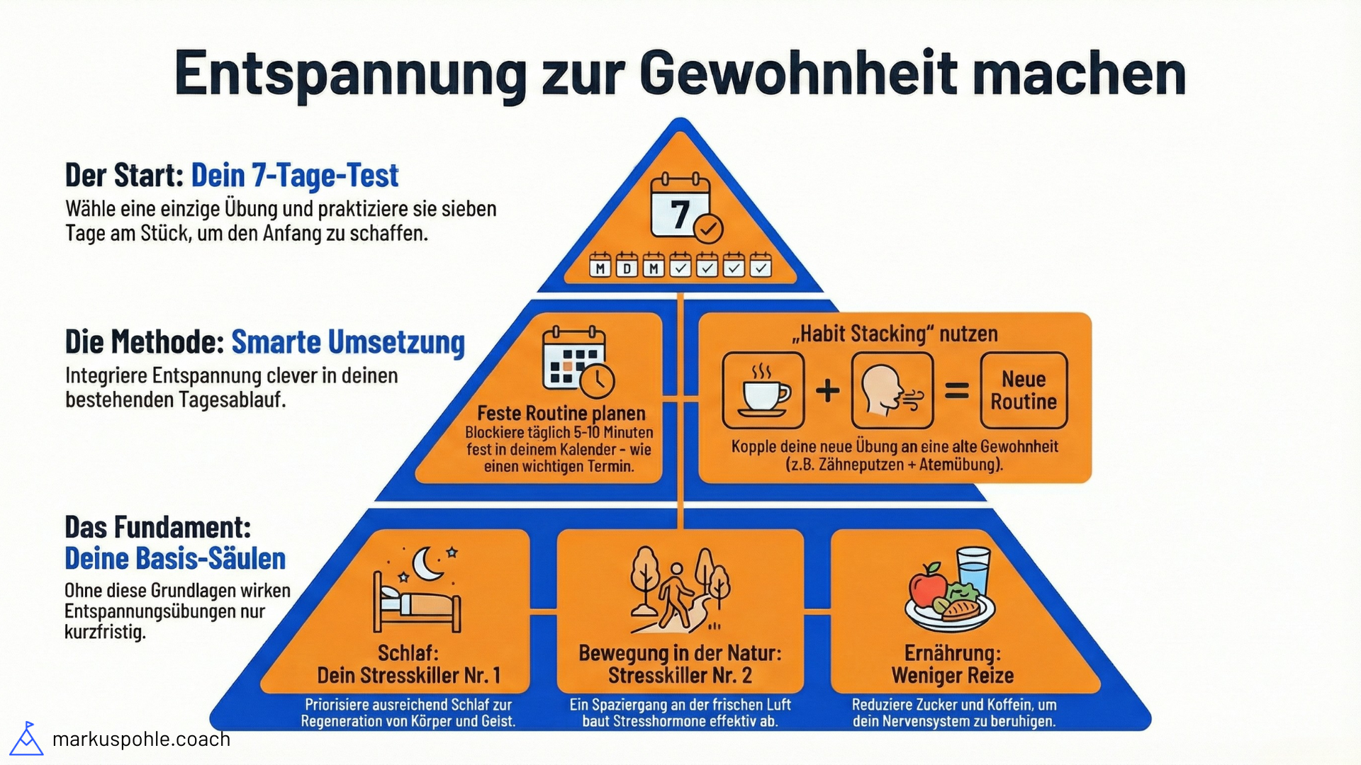 Pyramide zur Gewohnheitsbildung von Entspannung: 7-Tage-Test, smarte Umsetzung, Basis-Säulen (Schlaf, Natur, Ernährung).